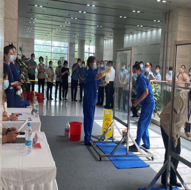 此次比赛活动内容丰富,玻璃清洁项目、洗地机操作项目每2人分为一组,比赛中主要考核玻璃清洁人员仪容仪表服务形象、讲解思路、临场表现、实际操作等;会议服务项目每4人为分为一组,主要考核形体展示、会议摆台、斟茶服务、会场清理等;安保消防技能项目每4人为分为一组,主要考核行走步伐、消防服穿戴、水带连接等内容。